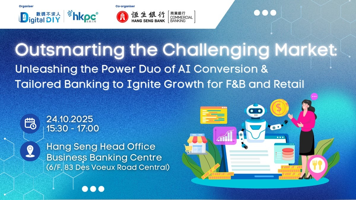 HKPC "Digital DIY" Portal (DDIY) and Hang Seng Business Banking have partnered to present the "Outsmarting the Challenging Market: Unleashing the Power Duo of AI Conversion & Tailored Banking to Ignite Growth for F&B and Retail" seminar, designed to equip SMEs with powerful digital tools to accelerate their growth.