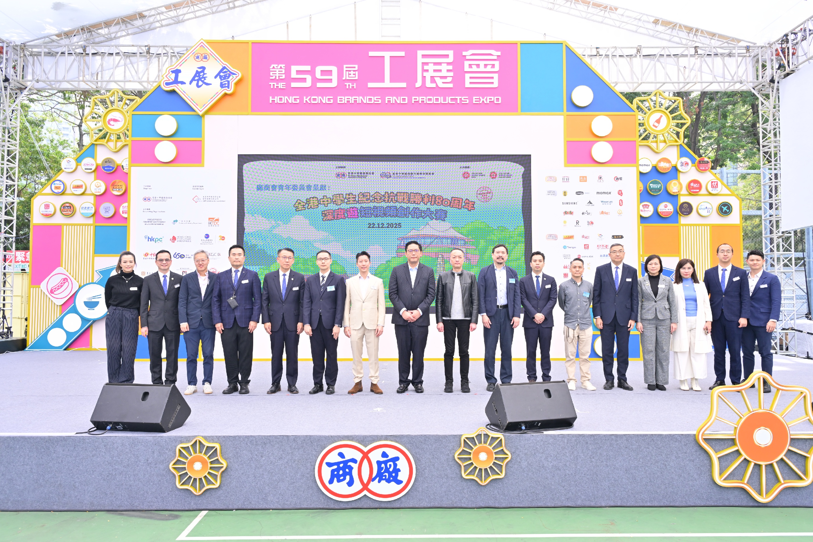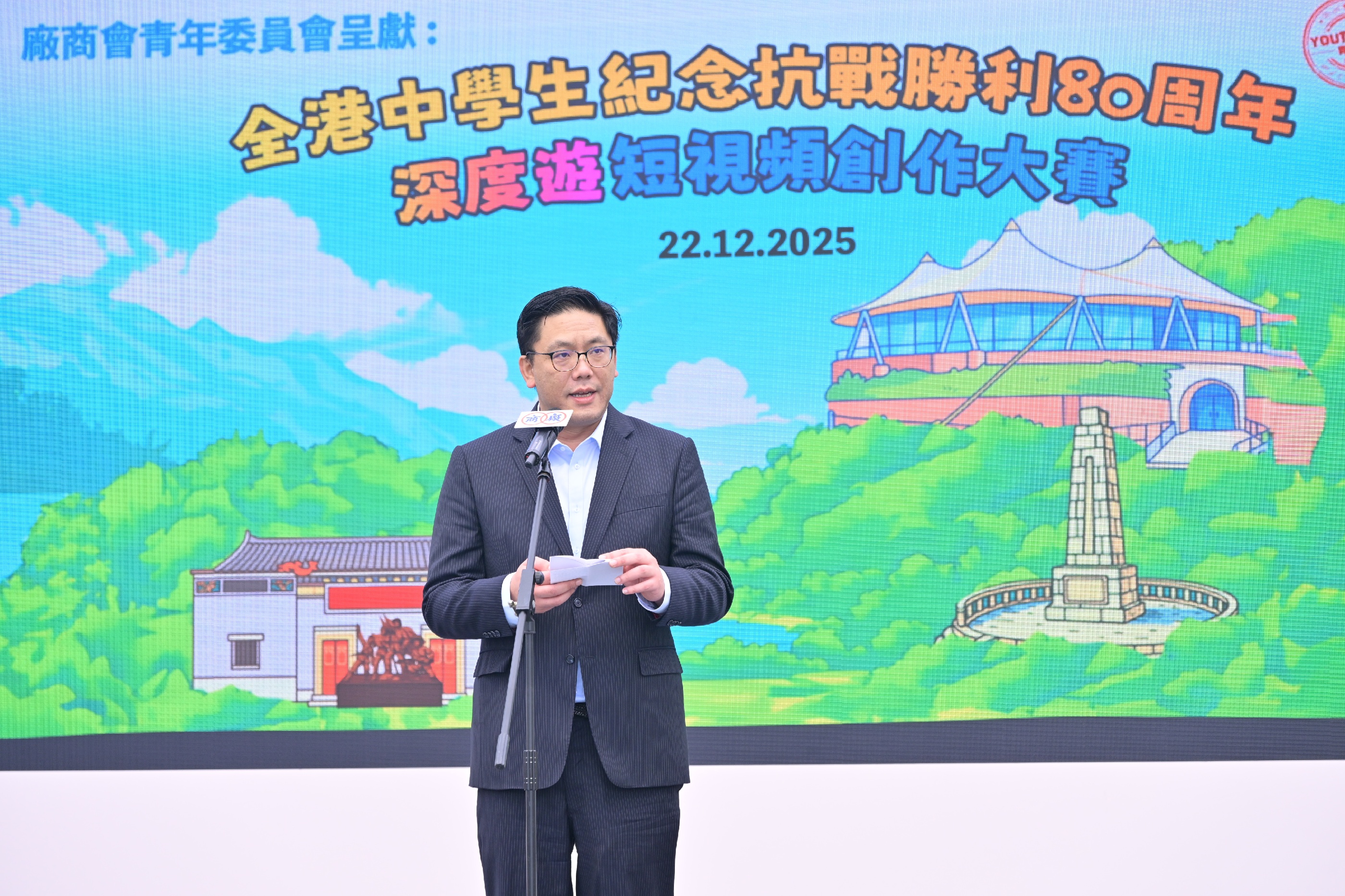 「全港中学生纪念抗战胜利80周年深度游短视频创作大赛」颁奖典礼昨日(22日)假铜锣湾维多利亚公园的工展会会场内举行,邀得民政及青年事务局副局长梁宏正担任主礼嘉宾、教育局首席教育主任(课程发展)李建寰等担任颁奖嘉宾,以及导演区焯文作为分享嘉宾。