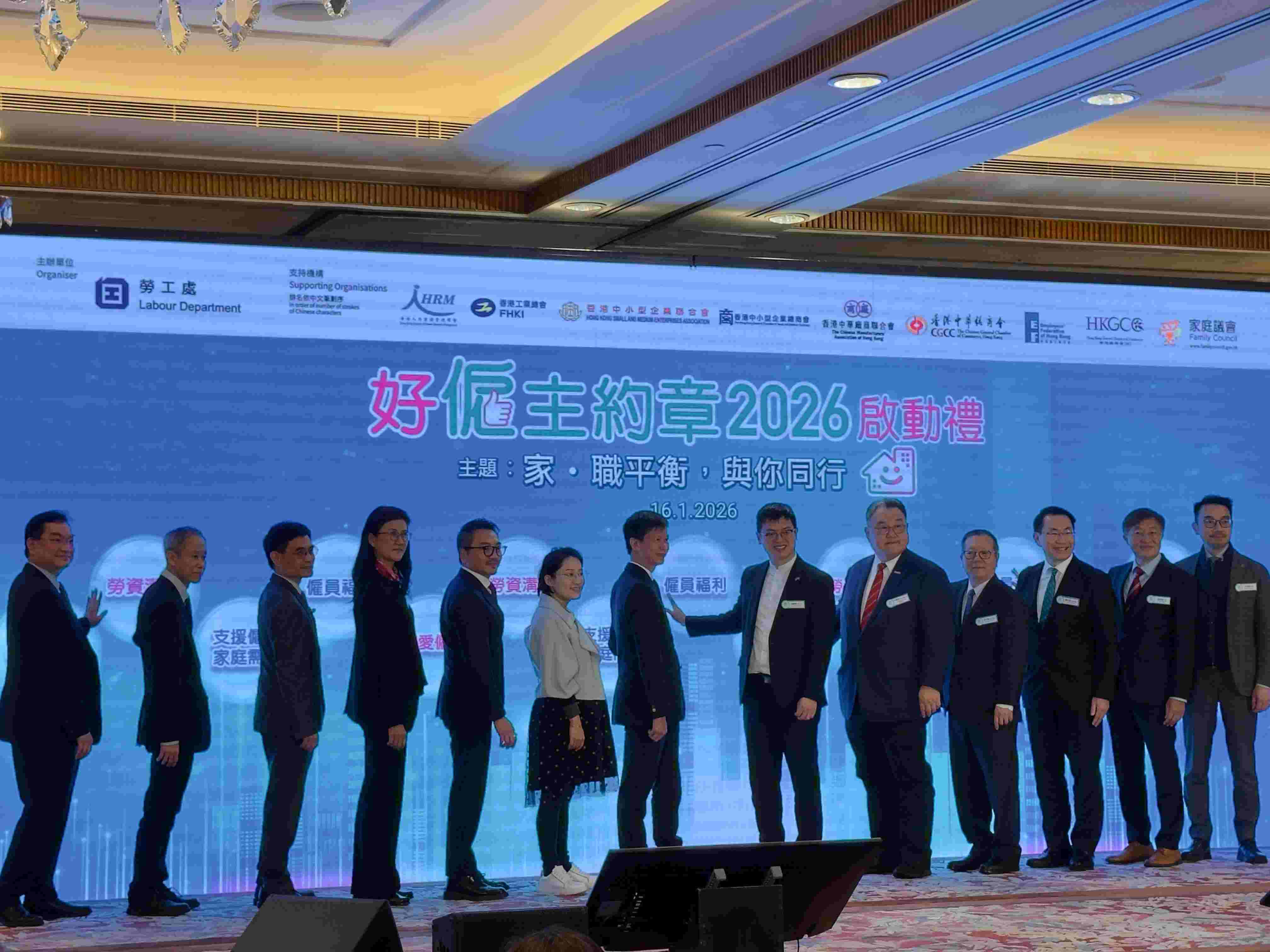 由劳工处主办,本会支持的「好雇员约章」2026启动礼于1月16日假九龙香格里拉酒店举行,马介钦常务副会长代表本会出席,并与主礼嘉宾劳工及福利局何启明副局长、劳工处许泽森处长及其他支持机构代表上台主持启动仪式及合照。