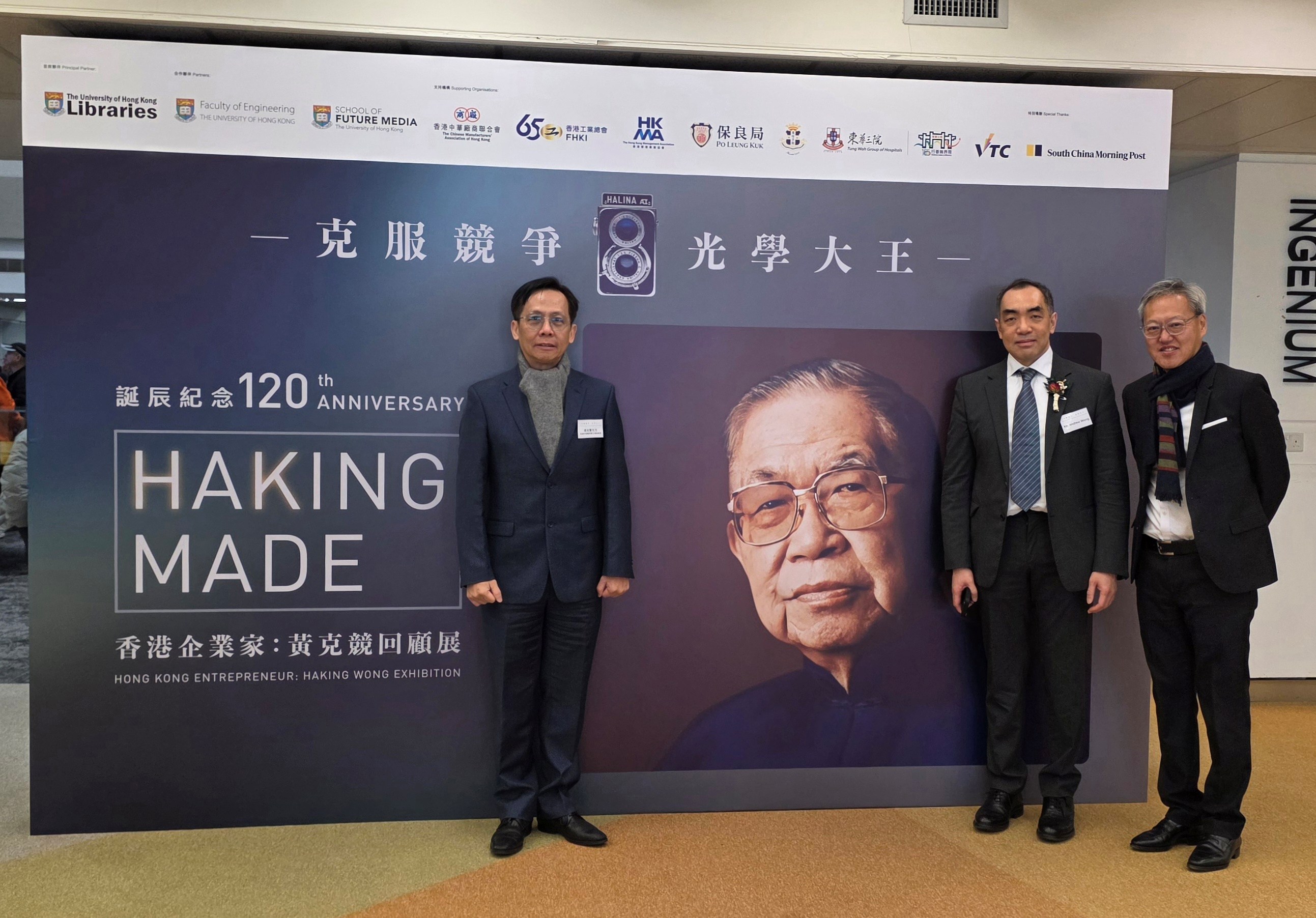 由已故会长黄克竞博士家族主办,本会支持的「诞辰120周年香港企业家:黄克竞回顾展」于1月7日假香港大学图书馆举行开幕典礼,梁兆贤副会长(左一)、徐晋晖常务会董出席(右一),卢金荣会长于早前亦应邀进行访问拍摄。