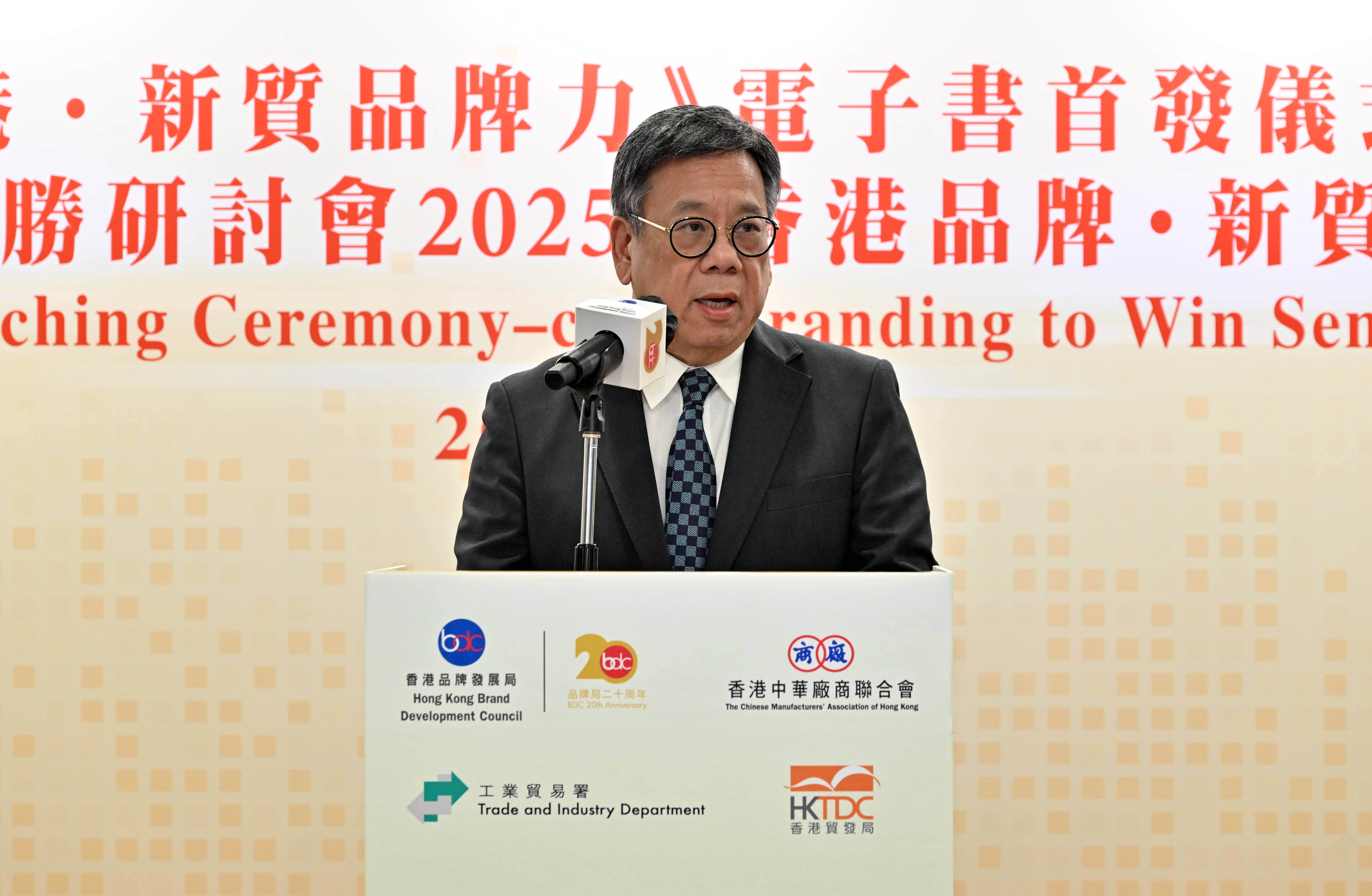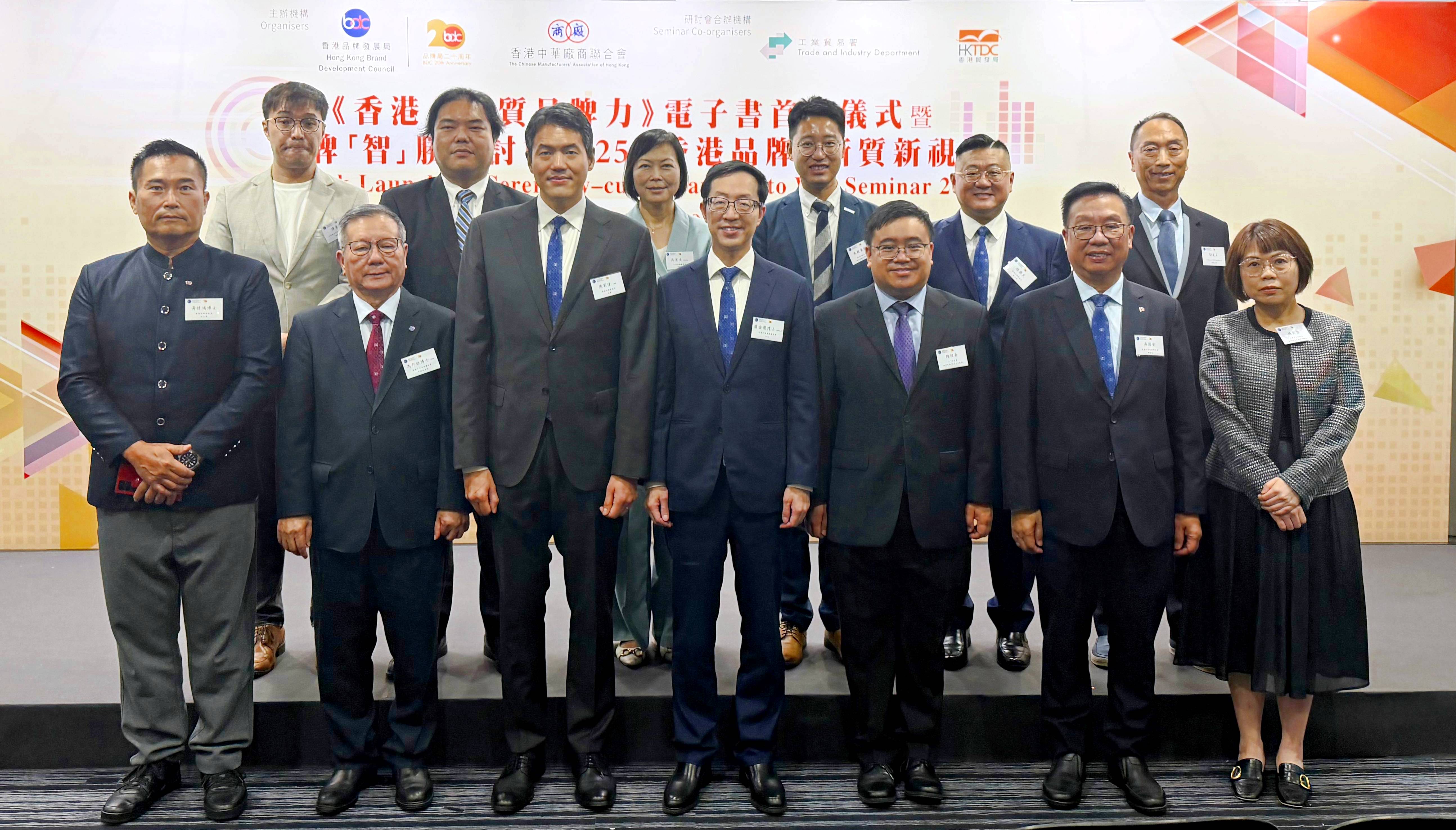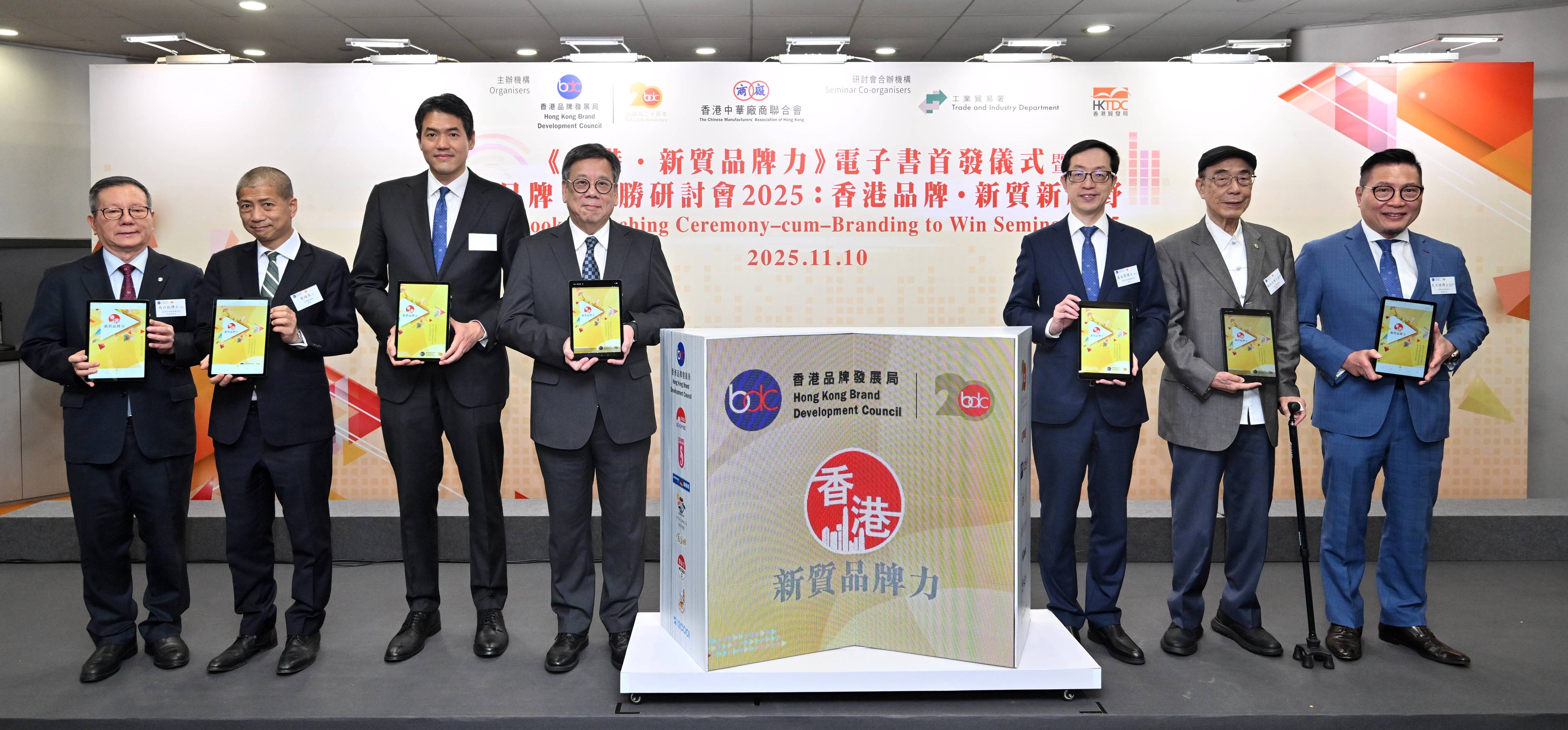 香港品牌發展局(品牌局)與香港中華廠商聯合會(廠商會)今日(11月10日)假香港貿發局中小企服務中心舉行《香港.新質品牌力》電子書首發儀式暨「品牌『智』勝研討會2025」,邀得商務及經濟發展局局長丘應樺擔任主禮嘉賓,並聯同廠商會會長盧金榮、品牌局主席陳家偉、品牌局榮譽主席楊孫西、知識產權署署長黃福來、品牌局榮譽主席史立德,以及廠商會常務副會長馬介欽一同主持首發儀式,宣布《香港.新質品牌力》電子書正式出版,供業界及市民免費閱覽。