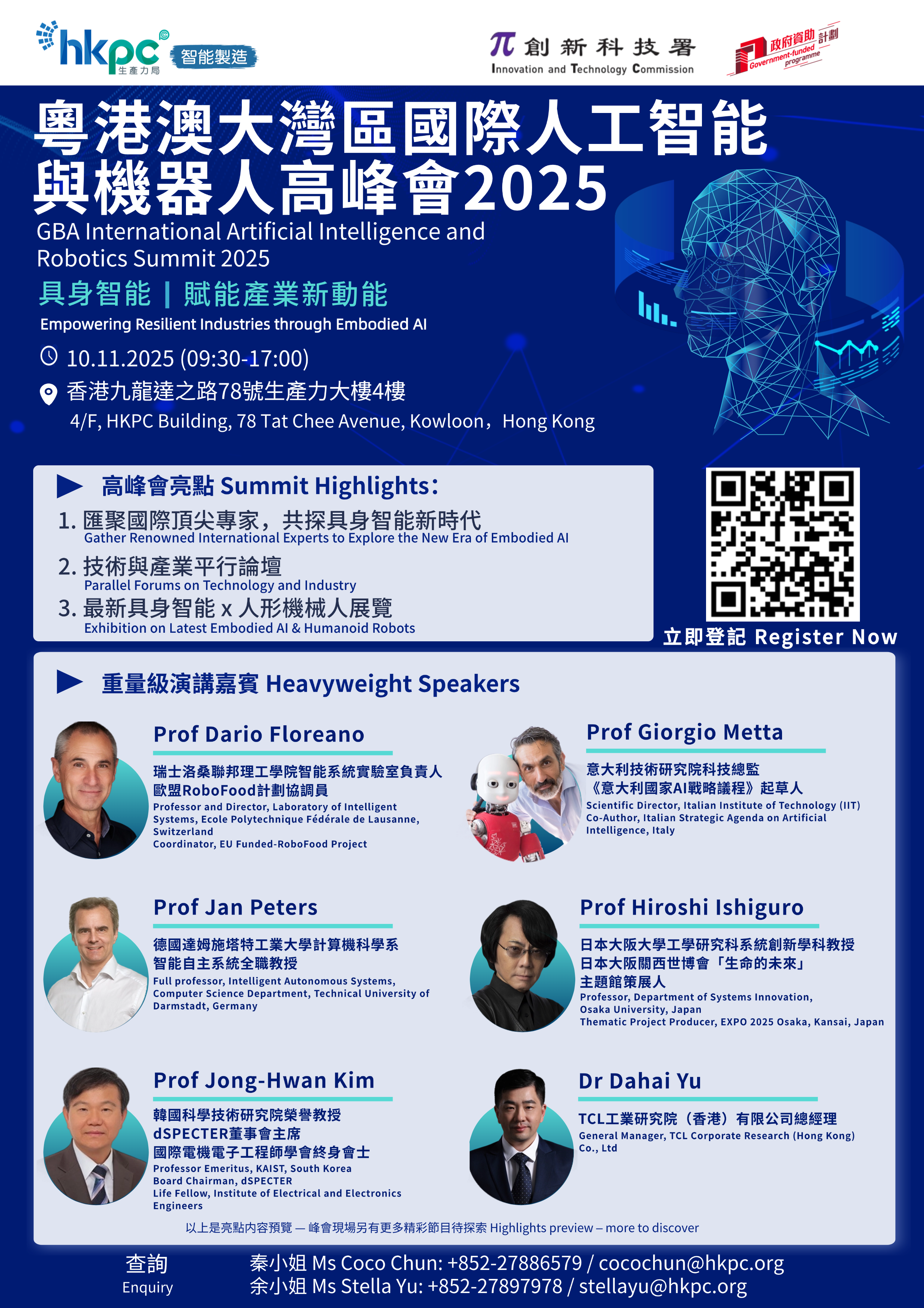 高峰會由香港生產力促進局主辦,本會支持。承繼去年各界熱烈迴響,本屆以更大規模、更強陣容載譽歸來,聚焦「具身智能|賦能產業新動能」主題,匯聚瑞、德、意、日、韓、中頂尖專家,共探智能未來。峰會內容豐富,包括13場主題演講、「產業應用」與「技術創新」兩大平行論壇及專題討論,並設一連四日人形機械人展覽。