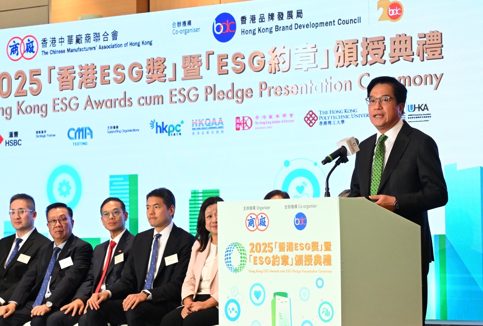 Embracing Environmental, Social, and Governance (ESG) practices is pivotal for enterprises to build long-term competitiveness and achieve sustainable development. To inspire Hong Kong businesses to further elevate their ESG performance, the Chinese Manufacturers’ Association of Hong Kong (CMA) hosted the 2025 Hong Kong ESG Awards cum ESG Pledge Presentation Ceremony today (17 October) at the Hong Kong Convention and Exhibition Centre.