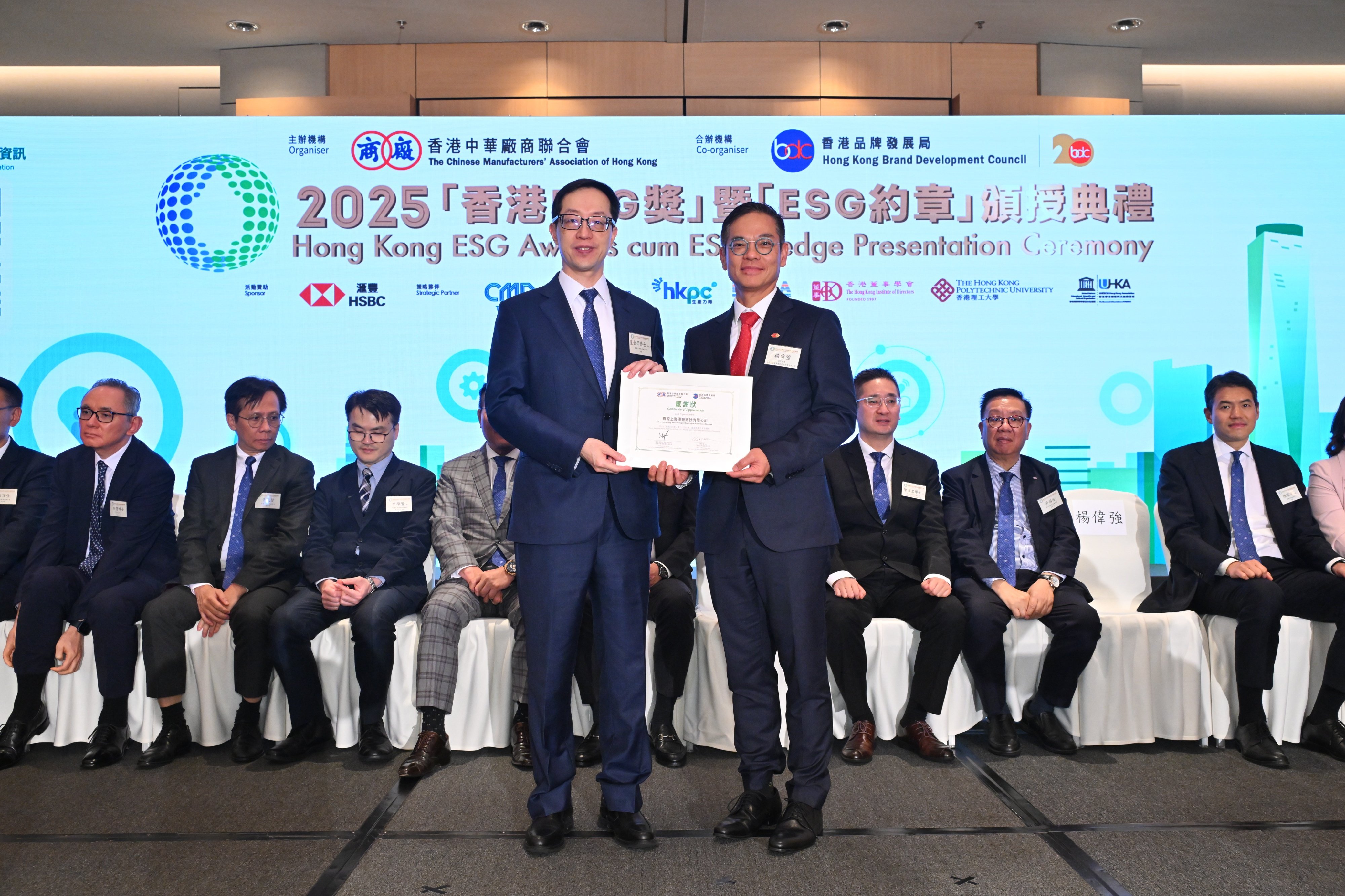 Mr Arthur Lee Hok Yin, Commissioner for Climate Change of the Environment and Ecology Bureau, and Mr Dennis Ng Kwok On, Vice President of the CMA, presented the ESG Certificate of Merit