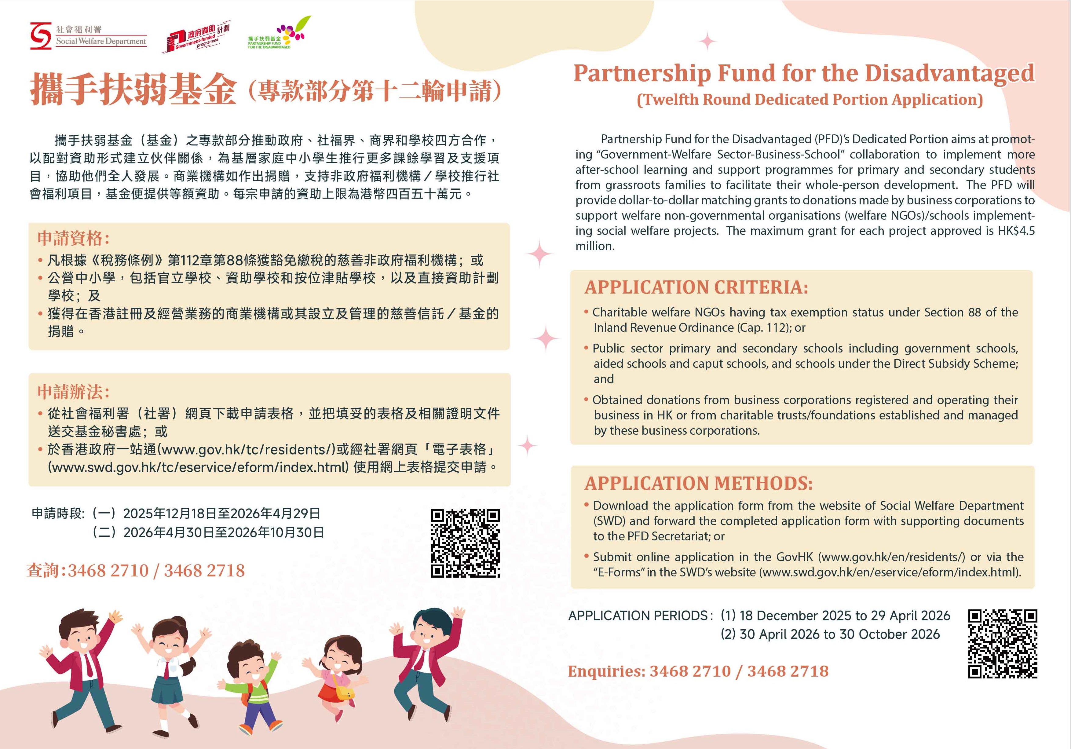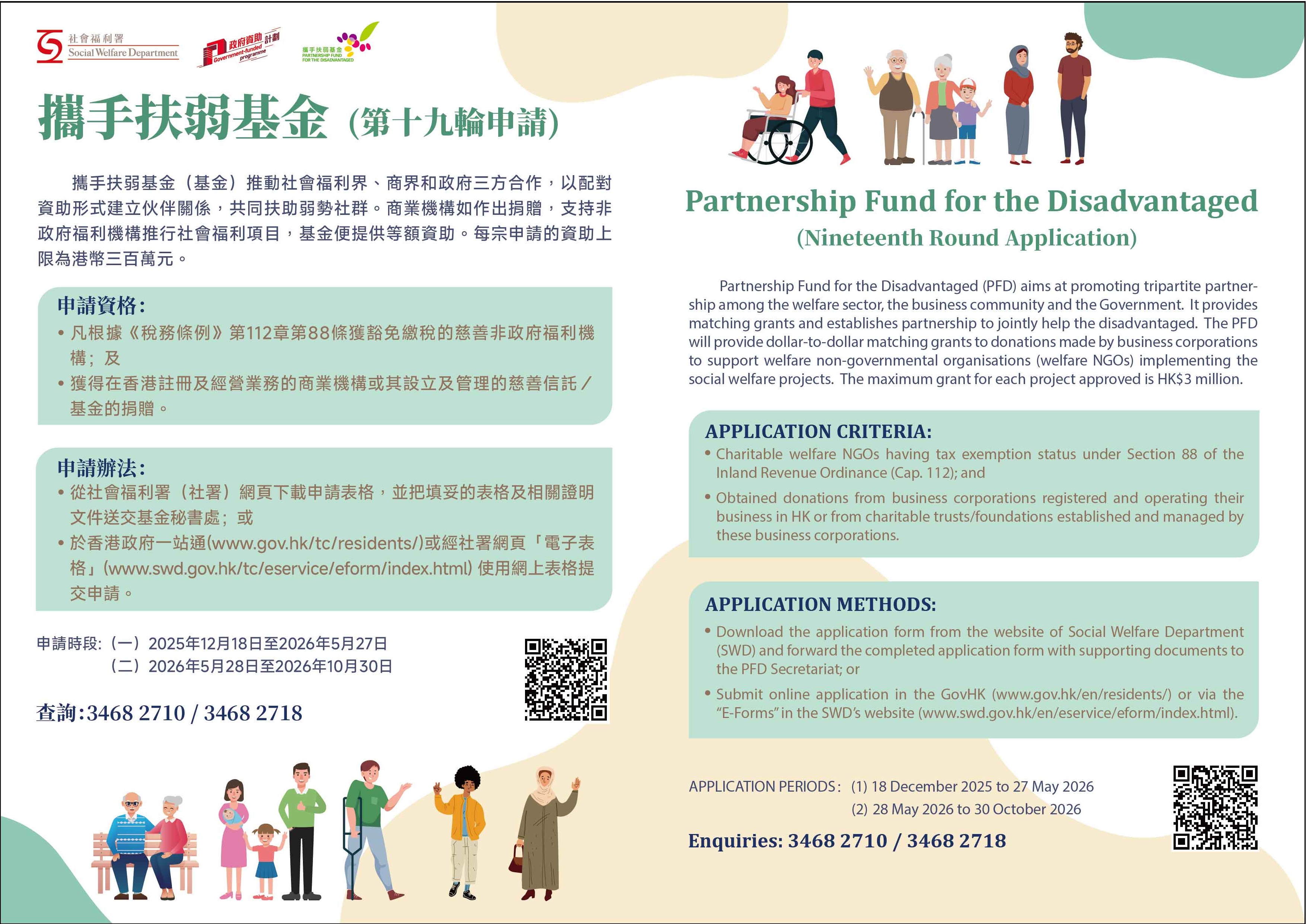 The Partnership Fund for the Disadvantaged (PFD), managed by the Social Welfare Department (SWD), is inviting the 19th round Regular Portion and the 12th round Dedicated Portion applications starting from now to 30 October 2026.