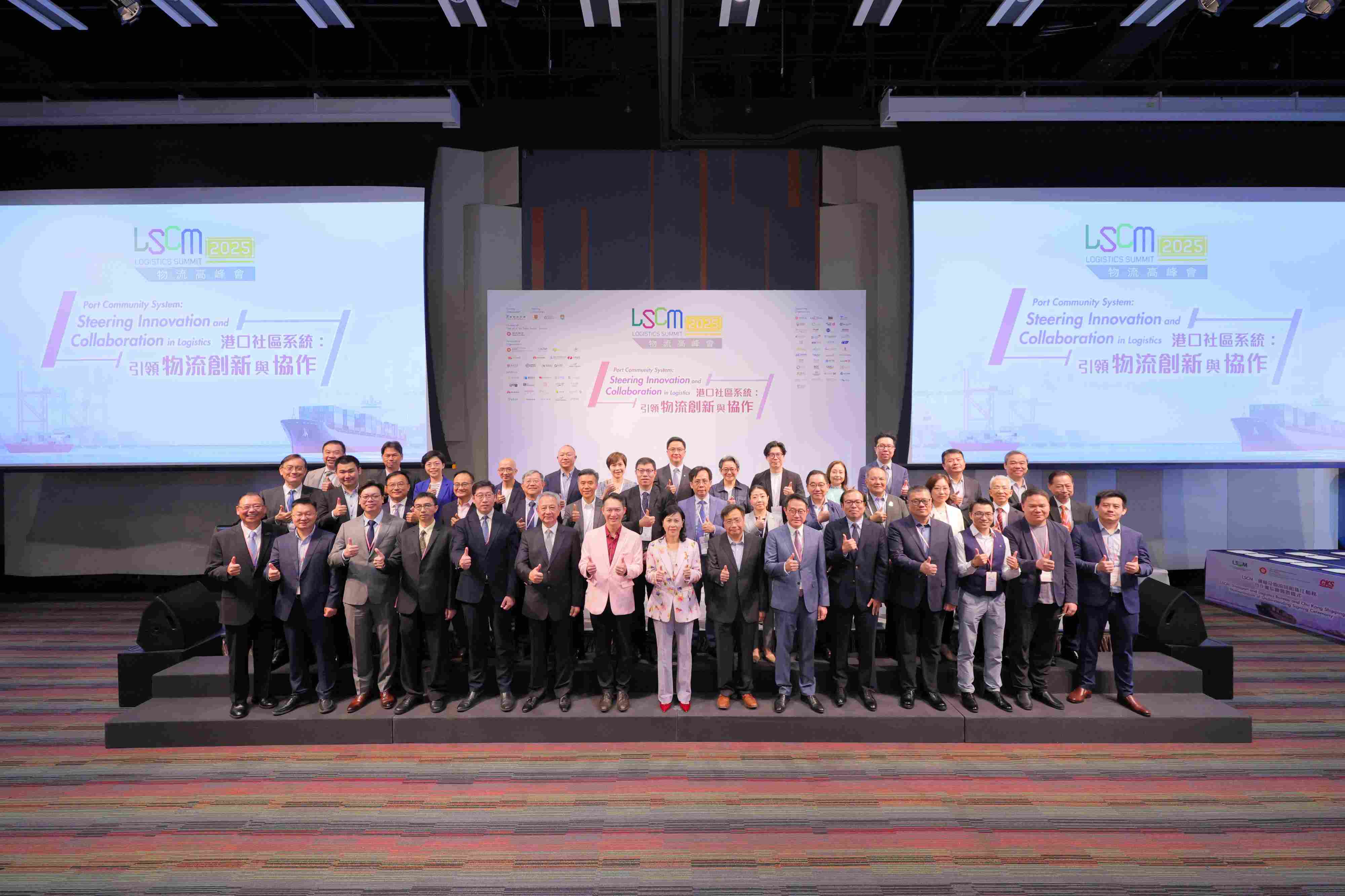 由物流及供应链多元技术研发中心主办,本会支持的「2025 LSCM物流高峰会」于10/10假香港科学园举行,梁兆贤副会长代表本会出席,并与主礼嘉宾运输及物流局陈美宝局长及其他嘉宾合照。