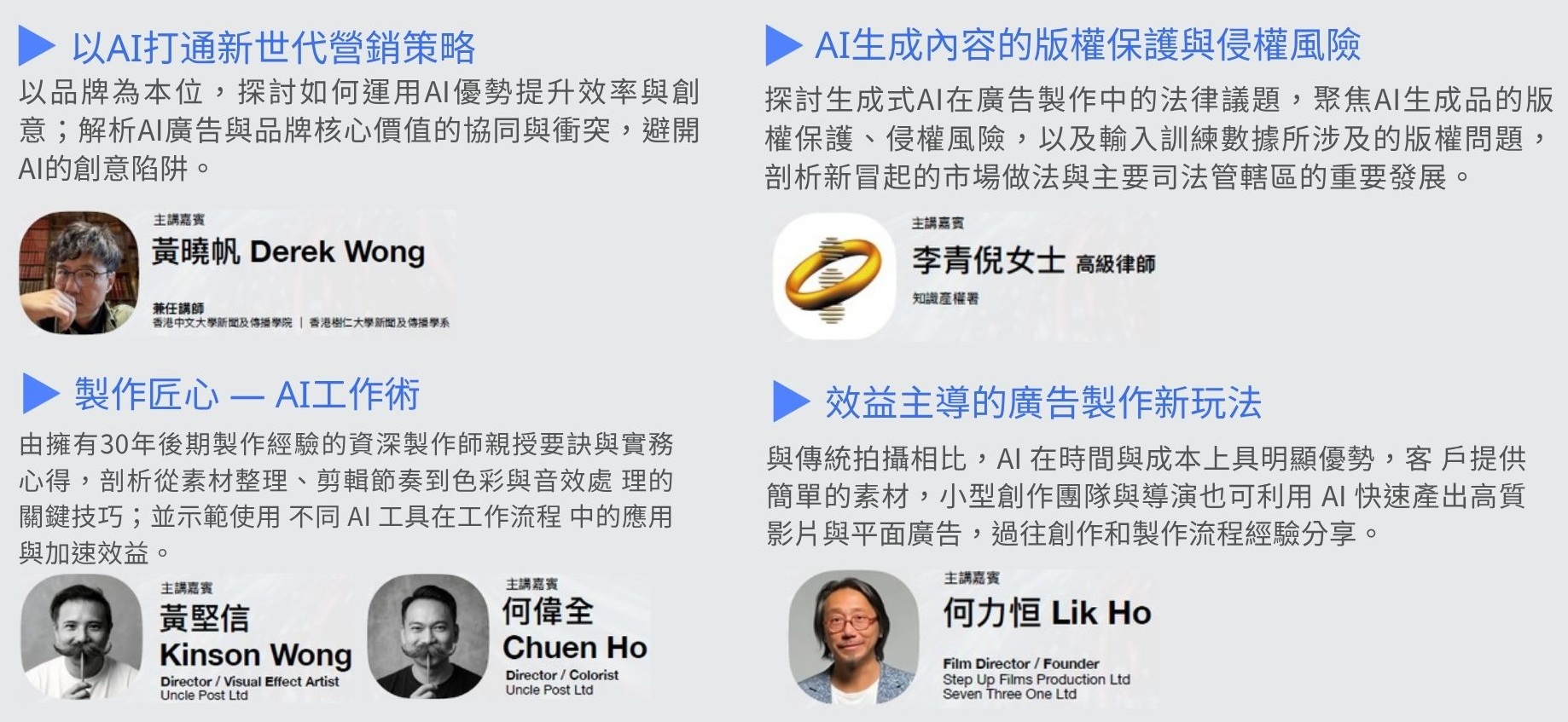 随着 AI生成创作广泛应用于市场企划、品牌宣传、内容制作与营销策略,企业通过运用低成本的AI在整体营销中创造最大价值,已成为不可或缺的「赢」商技巧。厂商会特邀请不同范畴的业界精英,分享AI在广告创作流程与技术上的应用,并针对AI版权保护与风险管理提供合规与风险管理建议;同时剖析AI在整体广告策划上的创新可能,提升广告作品的宣传效果。详情如下 :