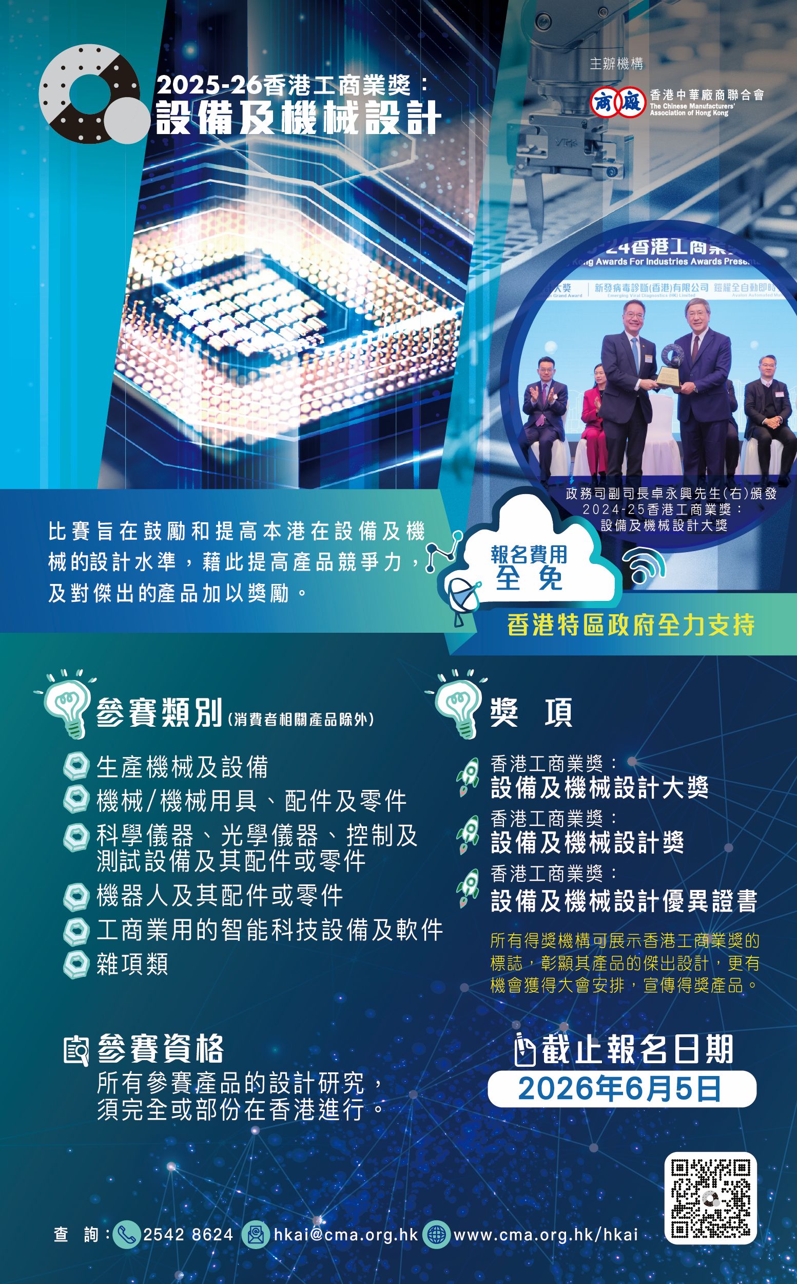 2025-26 「香港工商业奖:设备及机械设计」现已开始接受报名,截止报名日期为2026年6月5日,颁奖典礼将于2026年12月举行,欢迎报名参加。