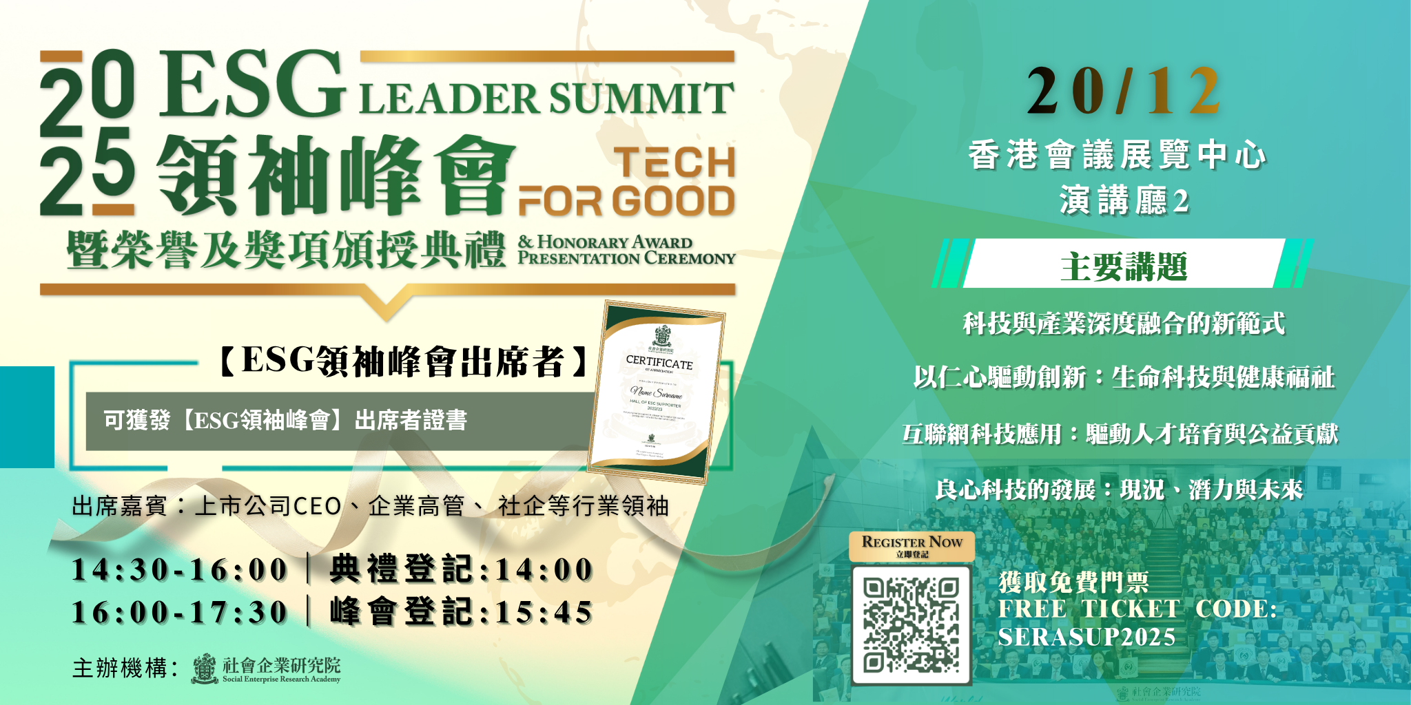 为预留门票给支持机构会员,请输入支持机构免费门票代号:SERASUP2025(先到先得),登记连结:https://bit.ly/2425Ceremony