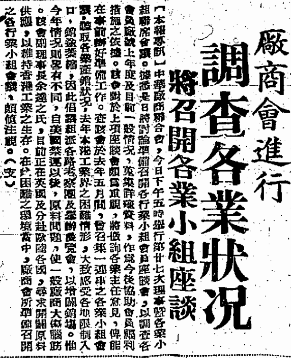 香港工商日報〈廠商會進行 調查各業狀況 將召開各業小組座談〉