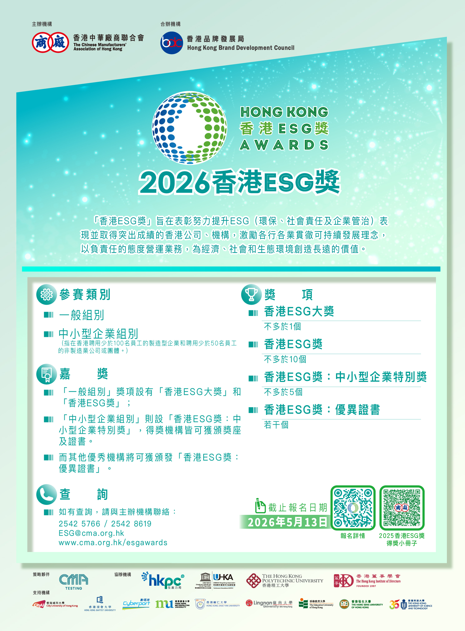 2026「香港ESG獎」現已開始接受報名,截止報名日期為2026年5月13日,頒獎典禮暫定於2026年10月舉行。