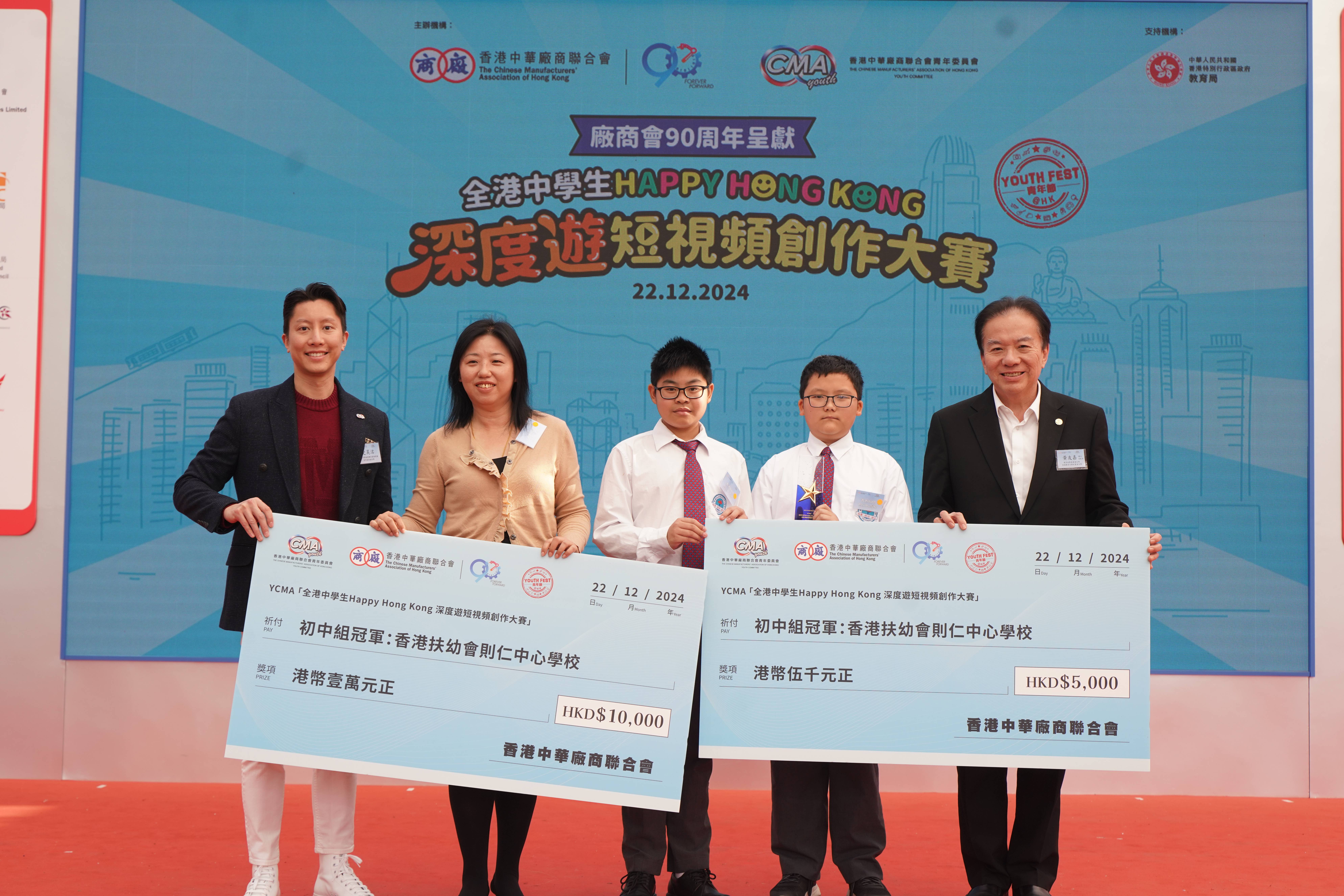 香港中華廠商聯合會(廠商會)青年委員會(青委會)致力推動青年發展,並向年青人傳遞以港為家的訊息,培育更多愛國愛港的新一代;適逢今年是廠商會成立90周年,青委會早前舉辦「全港中學生Happy Hong Kong深度遊短視頻創作大賽」,邀請全港中學生運用鏡頭,向海內外旅客呈現香港這個國際旅遊城市的多元魅力,最終大會共收到近150份參賽作品。頒獎典禮於今日(22日)假銅鑼灣維多利亞公園的工展會會場內舉行,邀得民政及青年事務局副局長梁宏正,以及教育統籌委員會主席、香港教育大學校董會主席黃友嘉博士擔任主禮嘉賓。
