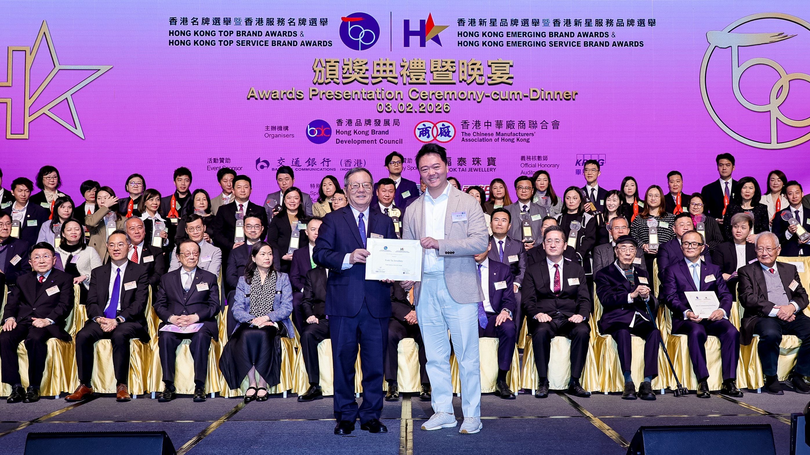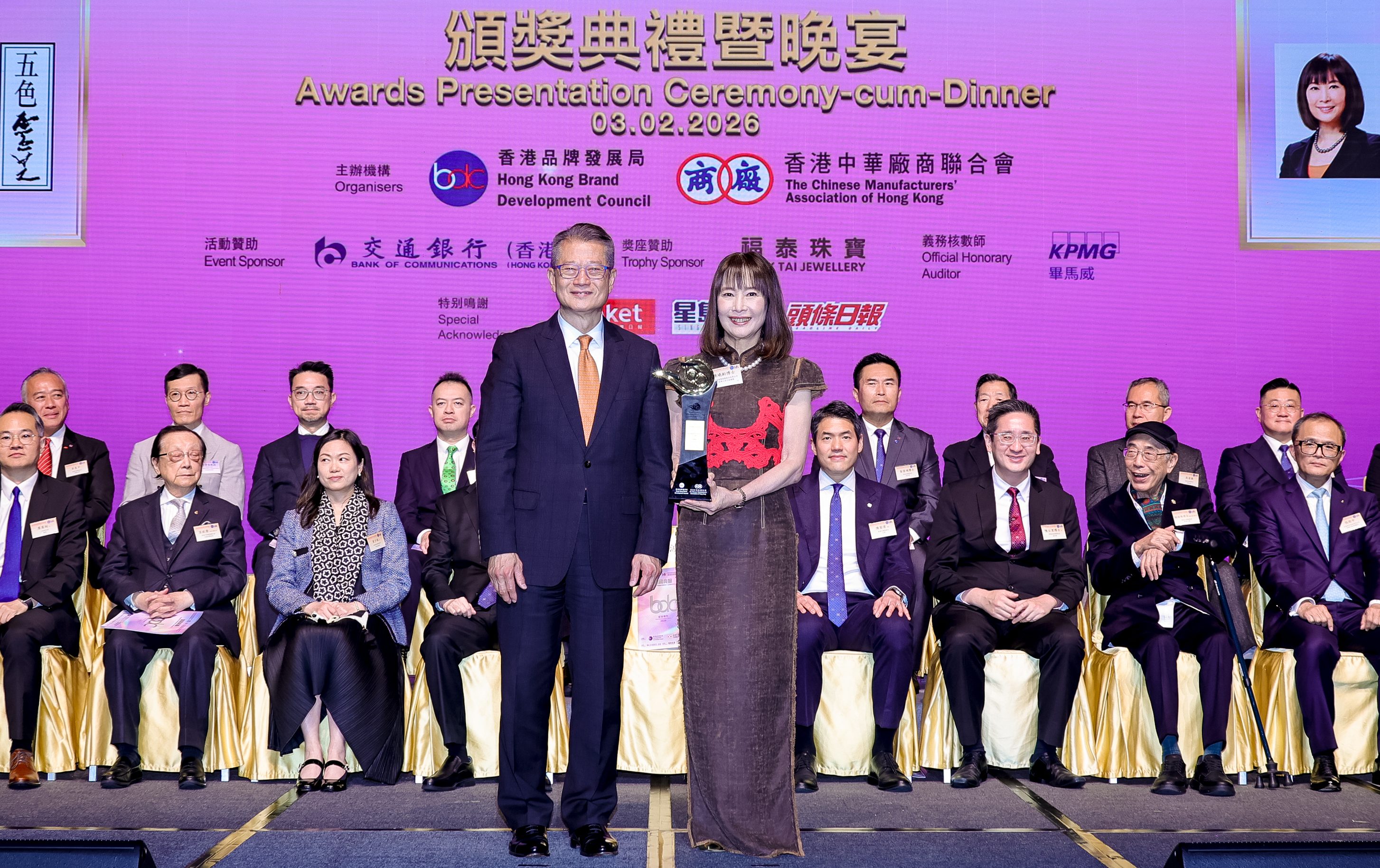 財政司司長陳茂波(前排左八)、廠商會會長盧金榮(前排左七)、品牌局主席陳家偉(前排右八)與一眾嘉賓、評審及得獎公司代表合照