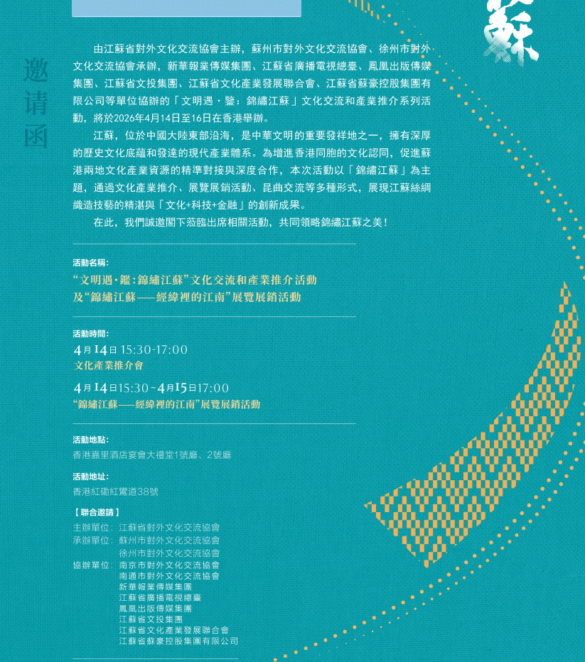 江蘇文化產業推介會旨在介紹江蘇省的文化產業,以及與香港的合作前景。屆時蘇港兩地的重要領導和嘉賓均將出席發言。而“錦繡江蘇—經緯裡的江南”展覽展銷活動旨在探討蘇港兩地在文化領域的合作,屆時江蘇省的絲綢、非遺IP等文創產品均面向香港市民開放銷售。