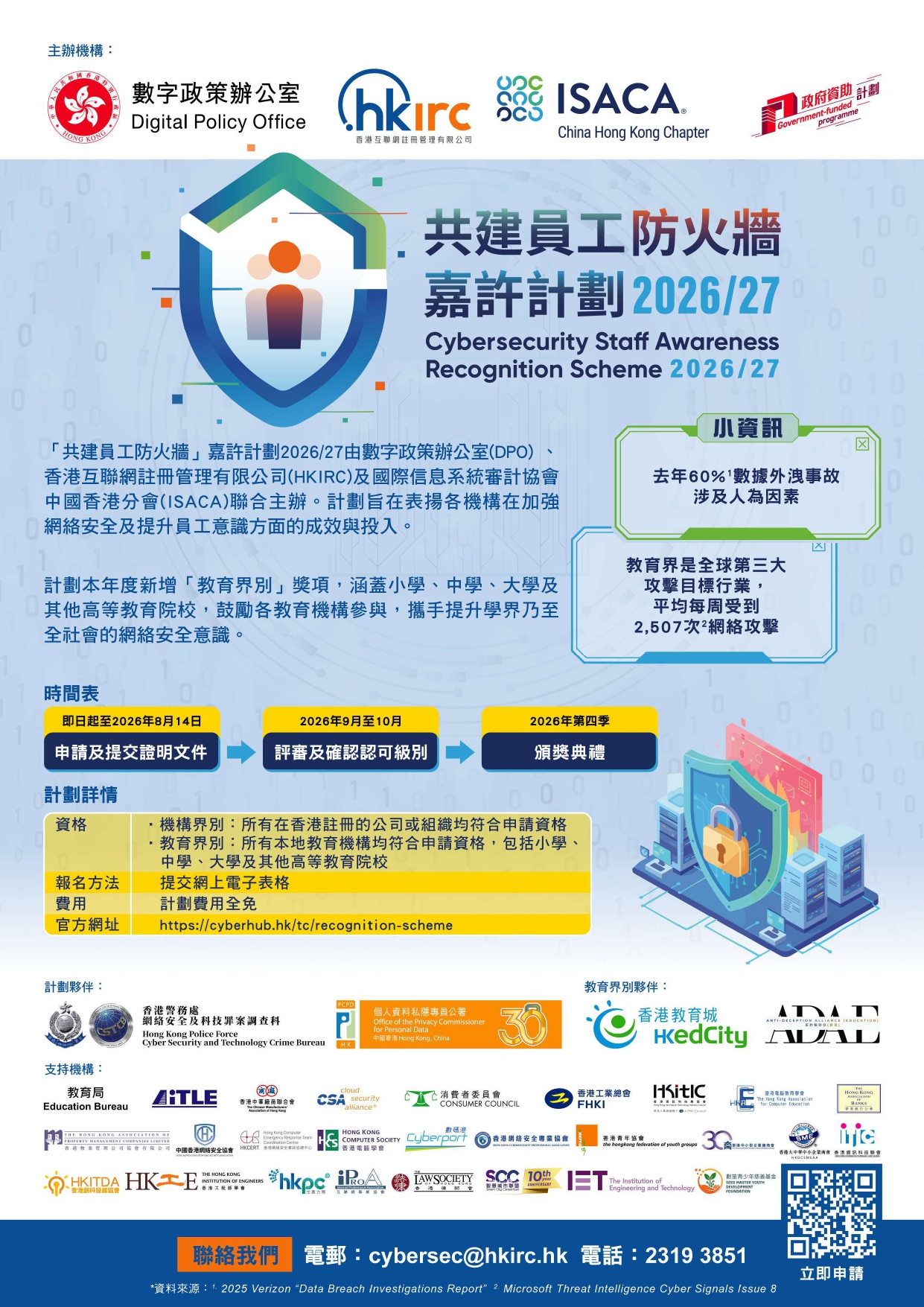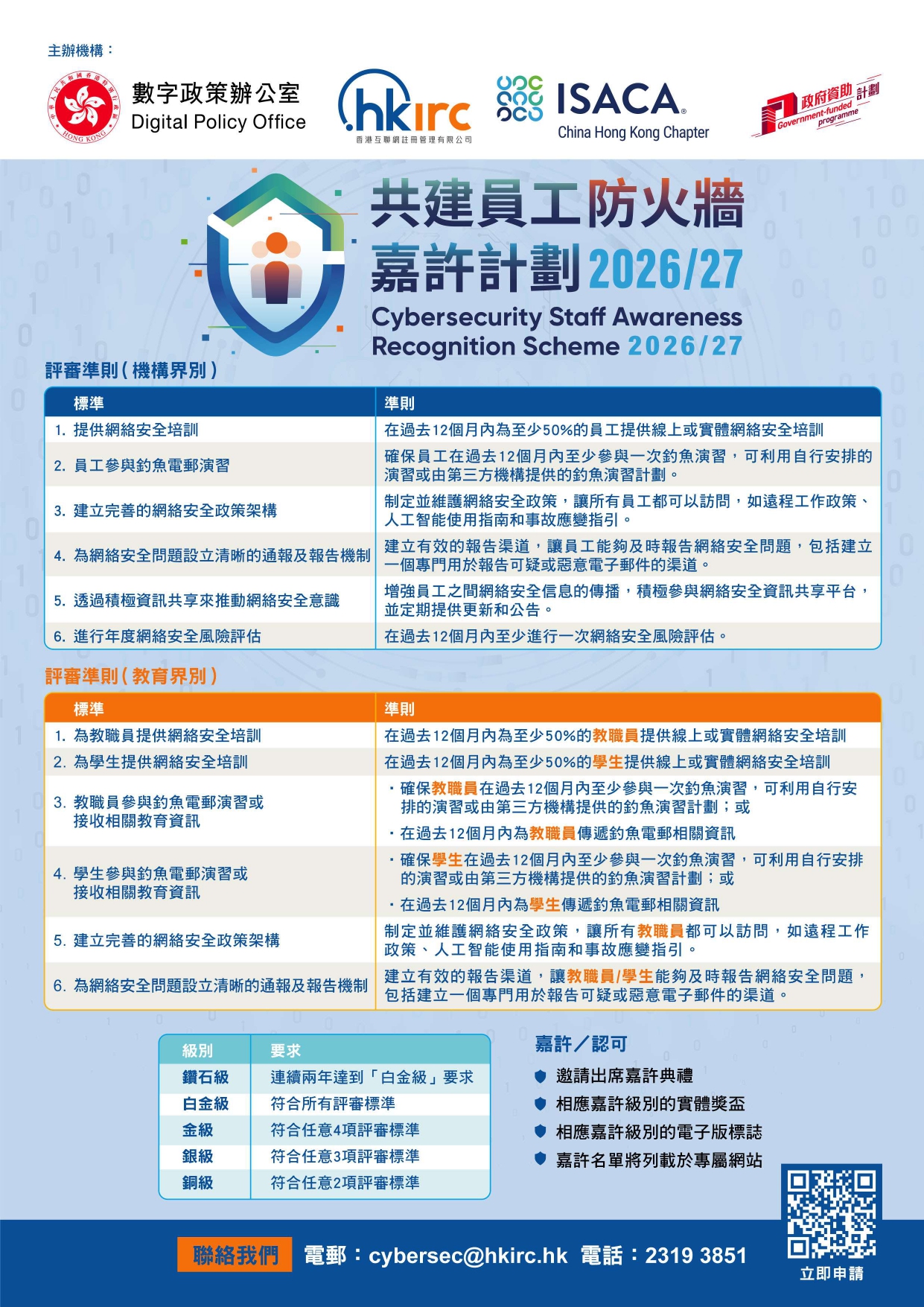 「共建員工防火牆」嘉許計劃2026/27由數字政策辦公室 (DPO)、香港互聯網註冊管理有限公司 (HKIRC)、國際信息系統審計協會中國香港分會 (ISACA) 主辦,本會支持,旨在表揚各機構在加強網絡安全及提升員工意識方面的成效與投入。